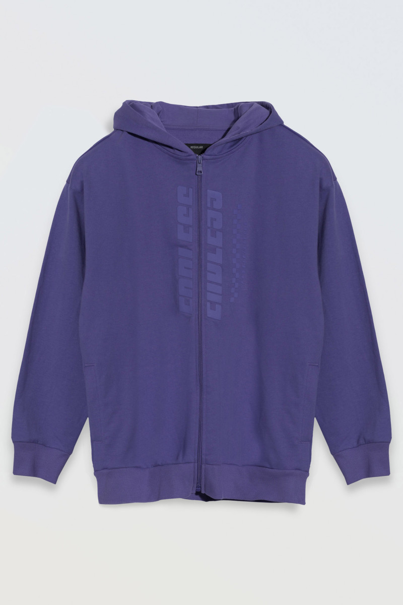 Fioletowa bluza z kapturem z nadrukiem z przodu zapinana na zamek wykonana z bawełny czesankowej wysokiej jakości