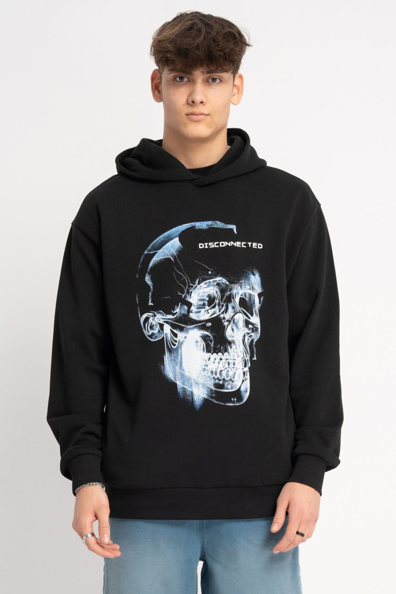 Czarna bluza z kapturem z autorską grafiką z przodu to połączenie wygody i oryginalnego designu inspirowanego promieniami Rentgena. Luźny krój i długość do bioder zapewniają komfort, a wysokiej jakości bawełna czesankowa jest miękka i przyjemna w dotyku. Obszerny kaptur dodaje charakteru, a rękawy oraz dół bluzy wykończyliśmy ściągaczami dla lepszego dopasowania. Wpuszczane kieszenie po bokach sprawiają, że jest jeszcze bardziej funkcjonalna. Kontrastowa grafika przyciąga wzrok i podkreśla unikalny styl Reporter. Do kompletu dostępny jest biały t-shirt z tym samym wzorem – stwórz swój własny set!