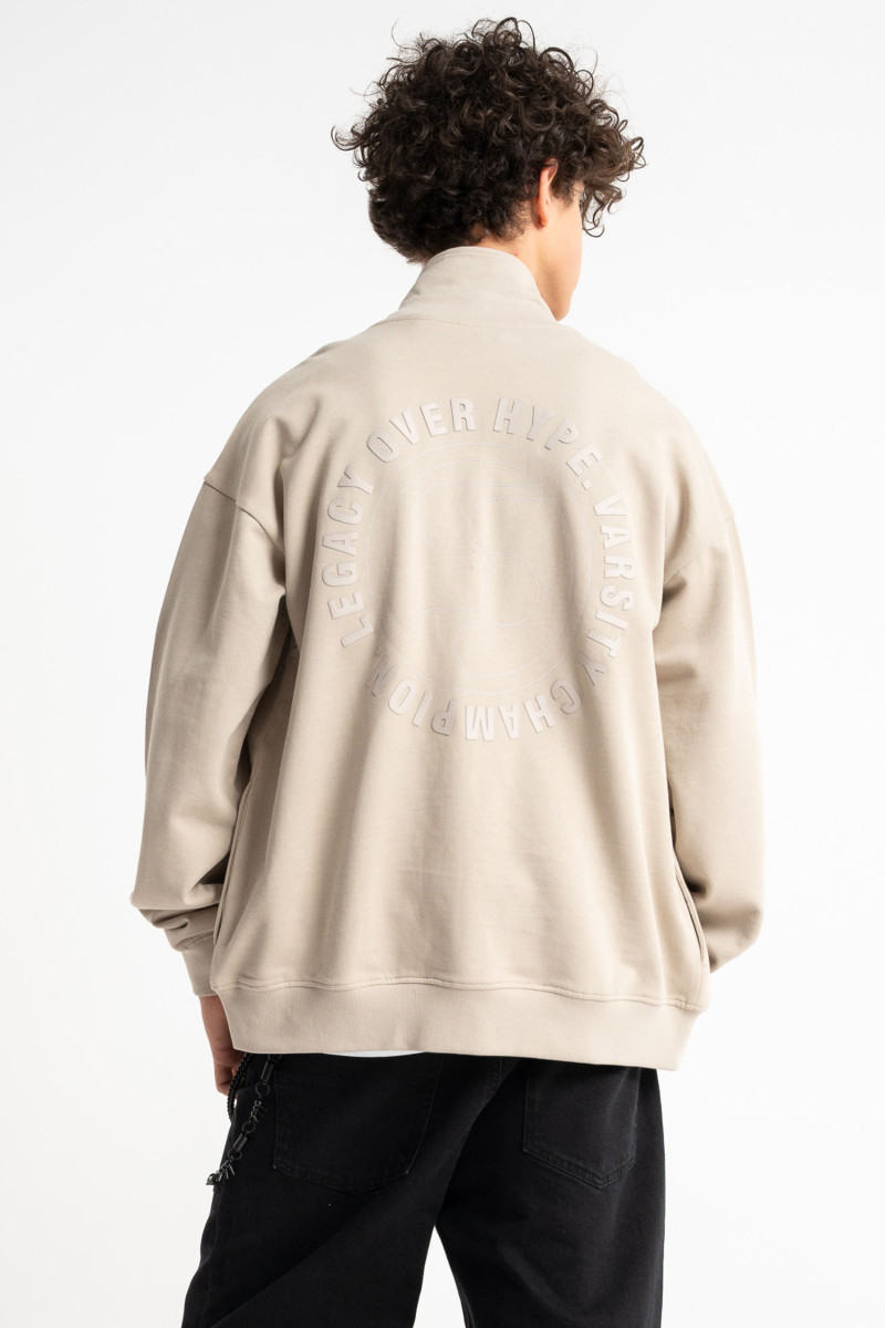 Beżowa bluza na stójce z autorską grafiką z tyłu zapinana na zamek wykonany z miękkiej, wytrzymałej i przyjemniej w dotyku bawełny terry wysokiej jakości