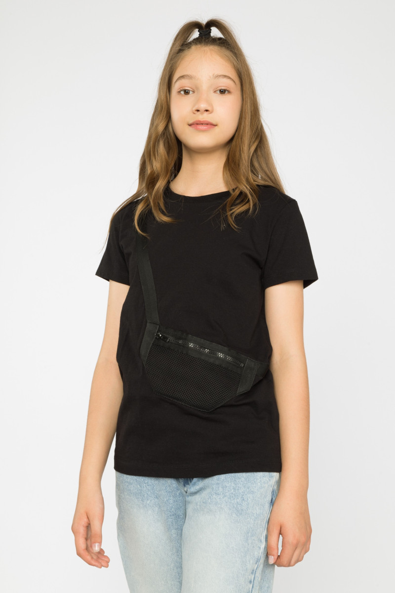 Czarna krótka spódnica z białymi lampasami po bokach.