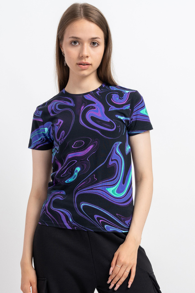 Czarny t-shirt z kolorowymi nadrukami na całości