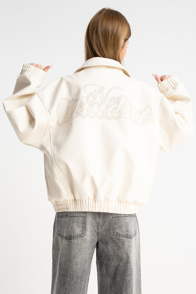 Kremowa kurtka ze skóry ekologicznej z modnym haftem z tyłu zapinana na zamek