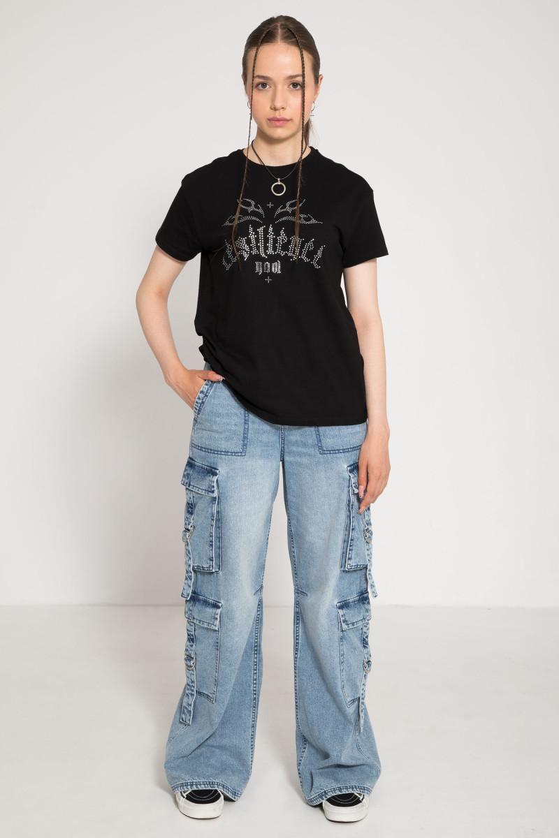 Nasze niebieskie jeansy typu cargo z szerokimi nogawkami to doskonały wybór dla młodzieży, która ceni modny, a jednocześnie wygodny styl. Luźny krój i szerokie nogawki zapewniają pełną swobodę ruchów, a efekt sprania nadaje im nowoczesny, streetwearowy charakter. Spodnie posiadają wpuszczane kieszenie po bokach, naszywane kieszenie z tyłu oraz przestrzenne kieszenie z troczkami na nogawkach, co czyni je wyjątkowo funkcjonalnymi. Zapinane na zamek i guzik, z szlufkami w pasie na pasek oraz regulowaną gumą wewnątrz, gwarantują idealne dopasowanie. Wykonane z miękkiego, bawełnianego jeansu, są trwałe i przyjemne w noszeniu. Model dostępny także w kolorze czarnym.