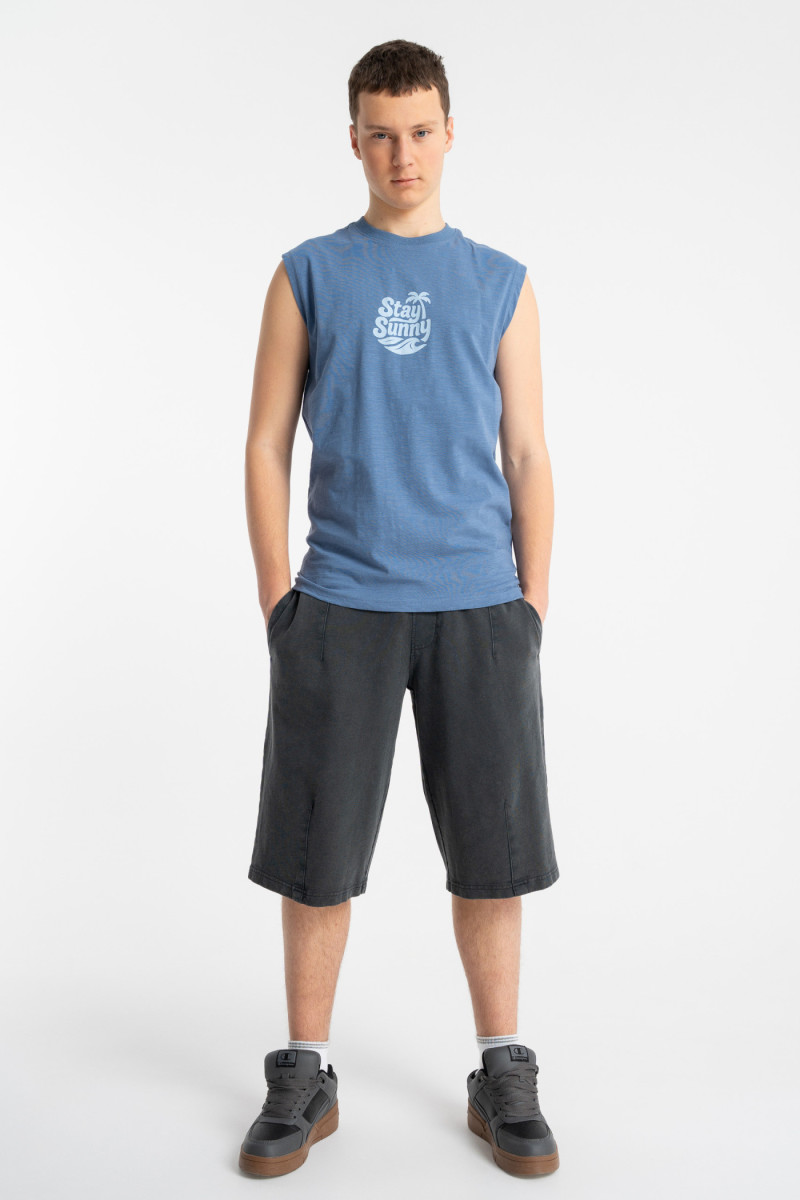 Ciemnoszare krótkie spodenki JORTS z efektem sprania to wygodna propozycja dla fanów swobodnego, miejskiego stylu. Projektujemy je w luźnym kroju z nogawkami o długości za kolano, które zapewniają pełną swobodę ruchu. W pasie zastosowaliśmy gumę z przeszyciami oraz sznureczki umożliwiające lepsze dopasowanie, dzięki czemu model świetnie układa się na sylwetce. Po bokach nogawek znajdują się praktyczne wpuszczane kieszenie, a przeszycia imitujące rozporek oraz modne cięcia na nogawkach nadają całości charakteru. Efekt sprania podkreśla streetwearowy klimat. Miękka dzianina dresowa jest przyjemna w dotyku. W Reporter tworzymy ubrania dobrej jakości z unikalnymi wzorami dla młodych.